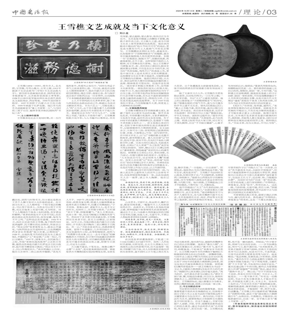 10月14日,《中国书法报》2025年第39期(总第539期)“理论版”整版刊登了我社书法指导老师刘小龙《王雪樵文艺成就及当下文化意义》一文。该文从士人精神、文章翰墨、守正创新等三方面,从艺术史层面深度阐释了“塞上书家第一人”王雪樵的艺术成就及守正创新的文化意义。