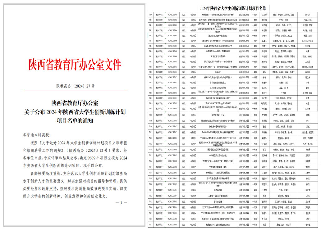 近日,陕西省教育厅办公室公布了2024年陕西省大学生创新训练计划项目名单,我校申报的121项大学生创新创业训练计划项目全部获批,其中省级立项81项,40项列为拟推荐国家级项目,实现省级项目和拟推荐国家级项目数量双增长。