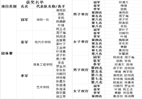 经过为期四天的激烈比拼,各项比赛的获奖名单均已揭晓。团体赛方面,体育学院凭借过硬的竞技实力摘得冠军,现代农学院荣获亚军,信息工程学院与艺术学院并列季军;单项赛方面,男子单打冠军由郑清文夺得,柳健与田凯分获亚军和季军;女子单打项目中,窦叶子摘得桂冠,刘桐羽、叶瑞分别斩获亚军和季军。男子双打冠军由杨闰淇与周子瀚组合夺得,田凯与李拓组合获亚军,郑清文与陈坤组合摘季军;女子双打项目里,刘桐羽与罗金洲,叶瑞与杨玉洁,黄静与何佳萌,三组选手以扎实功底脱颖而出,分获前三名。