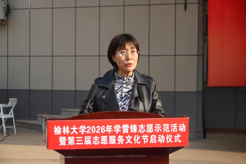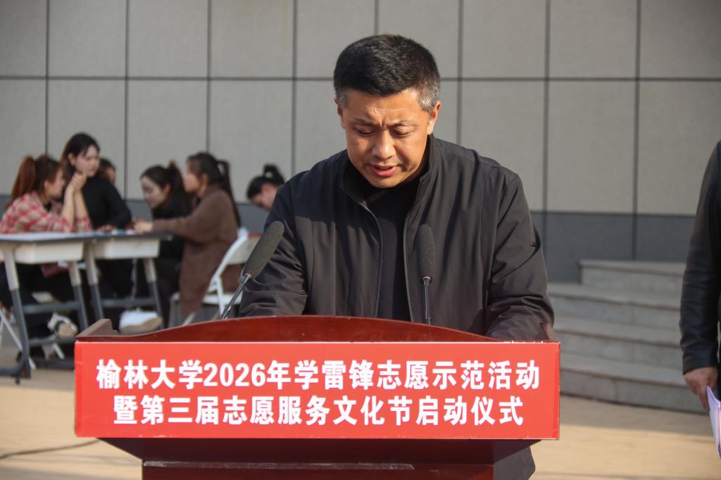 3 月 27 日,由校团委主办的榆林大学2026年学雷锋志愿示范活动暨第三届志愿服务文化节启动仪式在图书馆北广场隆重举行。本次活动以“学雷锋 做志愿 共同奋进十五五”为主题,同步启动全校全年常态化学雷锋系列志愿服务活动。榆林大学副校长卜耀军讲话,榆林市社会工作部四级调研员闫冰雁、市少先队总辅导员景娜、市红十字会党组成员及四级调研员高惠龙、共青团榆阳区委书记张悦应邀出席,学校相关职能部门负责人,各二级学院党总支副书记、团委书记,校团委全体干部及志愿者代表参加活动。仪式由校团委书记蹇攀峰主持。
