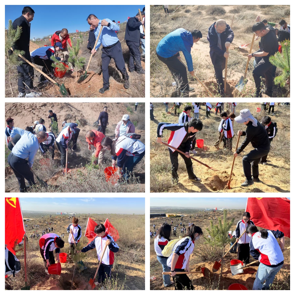 植树现场秩序井然、热火朝天,处处洋溢着劳动的热情。后勤管理处专业技术人员提前到场,围绕沙地造林技术规范,对樟子松栽植的株行距把控、覆土深度标准、分层踩实技巧及围堰蓄水要点等工序,进行详尽讲解与实操示范。在技术人员的悉心指导下,师生们自发组队、默契配合,挥锹铲土、扶正苗木、分层培土、围堰浇水,每一个环节都严谨规范、衔接有序。铁锹起落间,一株株樟子松幼苗稳稳扎根沙地;清流浇灌后,点点新绿为塞上初春增添盎然生机。劳动过程中,校长付峰与同学们并肩劳作、亲切交流,勉励广大青年珍惜躬身实践的宝贵机会,在辛勤劳作中砥砺意志品质、锤炼实干本领,自觉将生态文明理念内化于心、外化于行,以实际行动为地方生态建设贡献青春力量。历经三个多小时的合力奋战,600余株樟子松错落挺立在沙地上,宛如一排排绿色卫士,为初春的沙海筑起一道充满希望的生态屏障。