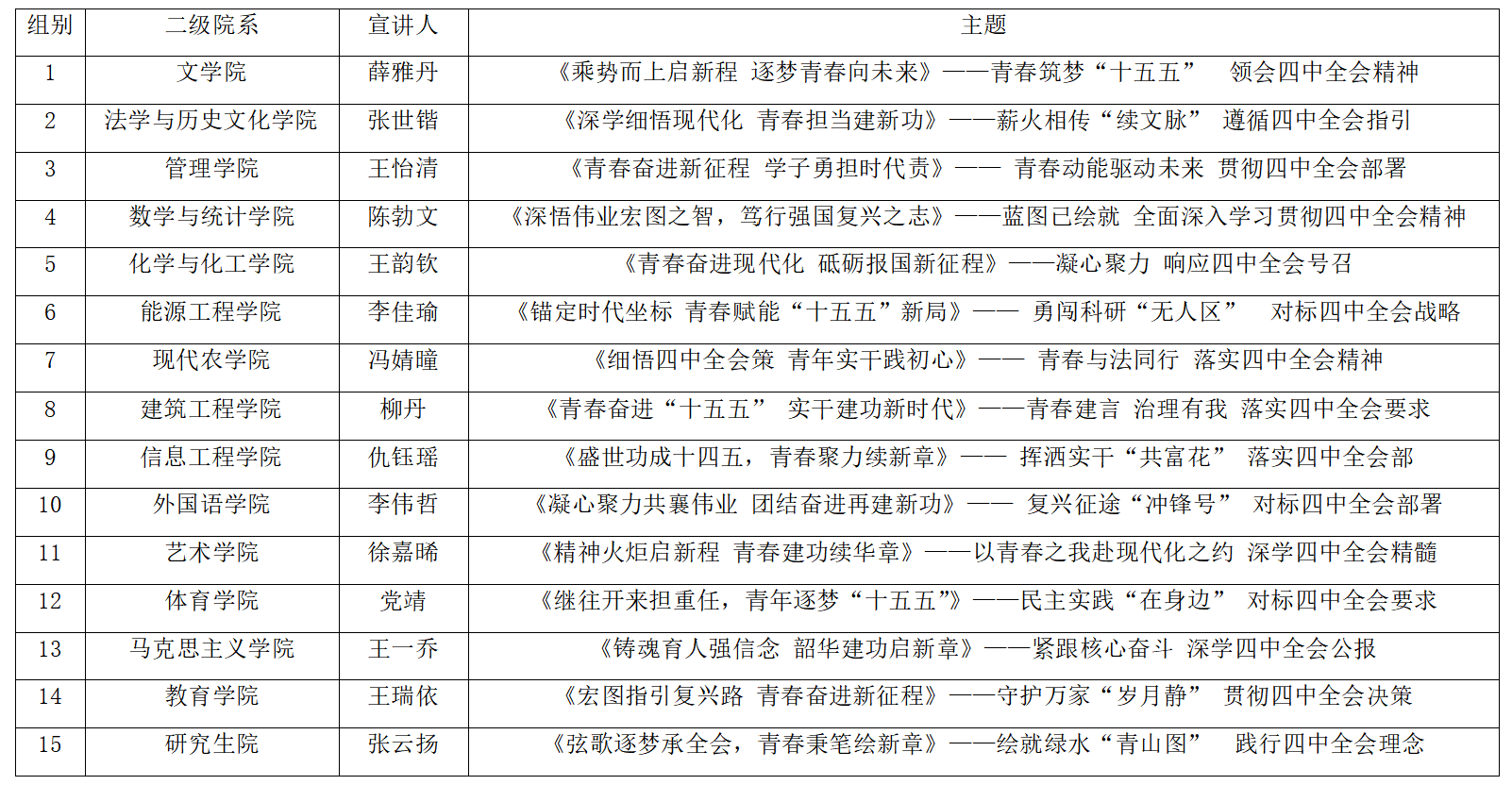 为深入学习宣传贯彻党的二十大四中全会精神,落实共青团中央“引导广大团员青年把思想和行动统一到党中央决策部署上来”的工作要求,引导全校青年学子深刻把握全会核心要义与“十五五”规划战略部署,将个人理想融入国家发展大局、青春奋斗汇入民族复兴征程,以理论清醒筑牢信仰之基,以实践担当锤炼过硬本领,经校团委研究决定,开展“青春建功新时代·团结奋斗向未来”学习贯彻党的二十届四中全会精神系列宣讲活动。现将有关事宜通知如下: