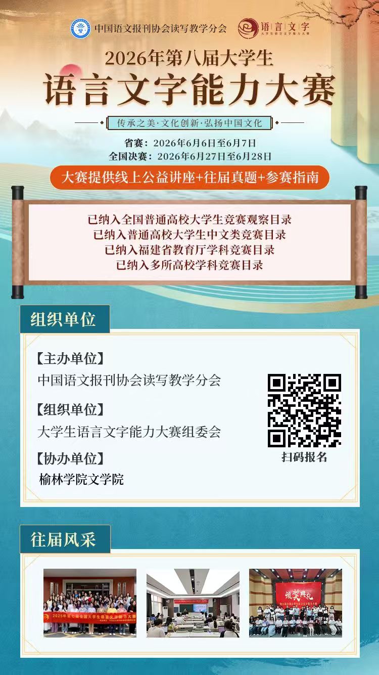 为深入贯彻落实《中华人民共和国国家通用语言文字法》《关于全面加强新时代语言文字工作的意见》等文件精神,传承弘扬中华优秀语言文化,全面提升我校学生语言文字规范意识与综合运用能力,2026年第八届全国大学生语言文字能力大赛正式启动。该赛事已纳入中国高等教育学会《全国普通高校学科竞赛排行榜》观察目录,具有较高权威性与认可度。为确保我校组织报名工作有序推进,现将有关事宜通知如下:
