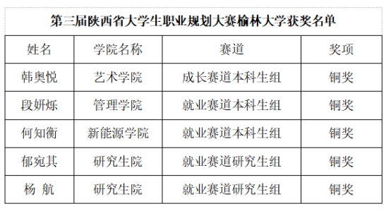 近日,第三届全国大学生职业规划大赛陕西赛区决赛落下帷幕。在这场汇聚全省高校青年才俊的巅峰对决中,榆林大学学子凭借扎实的专业功底、清晰的职业认知与从容的临场表现,勇夺5项铜奖,获奖数量创下学校参赛以来的历史新高,充分彰显了榆苑学子的综合素质与就业竞争力。