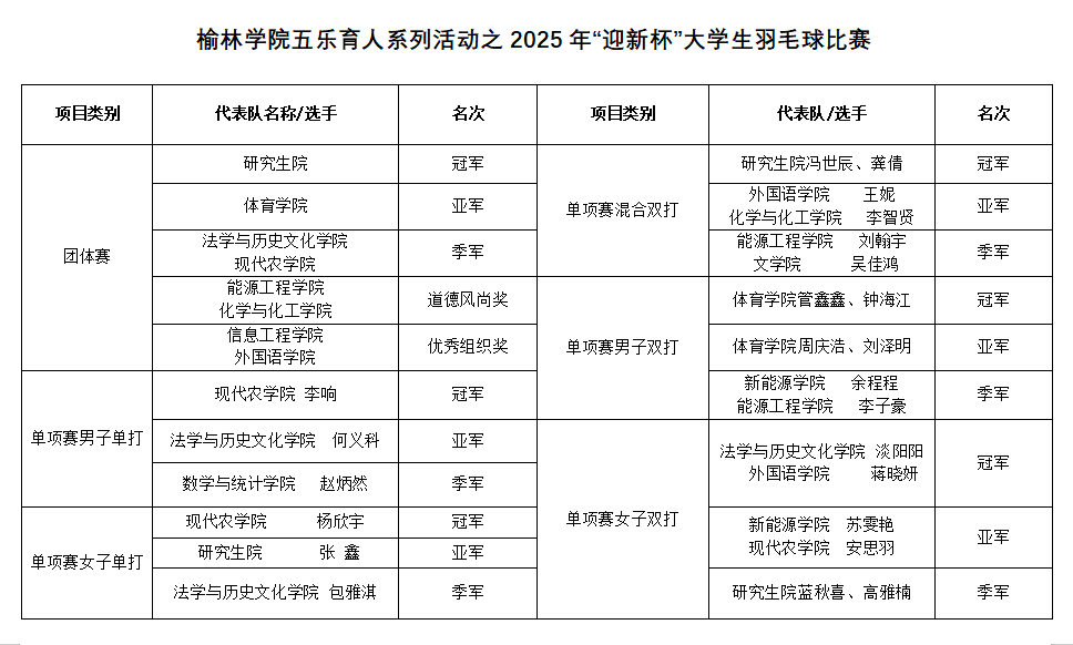 本次 “迎新杯” 羽毛球比赛的成功举办,既是学校积极响应全民健身国家战略的生动实践,也是“乐跑强体”育人理念的深度落地。赛事不仅为同学们搭建了交流展示的竞技平台,点燃了大家参与体育锻炼的热情,更以体育为桥促进新老学子深度融合,为构建健康阳光、积极向上的校园文化氛围注入新活力。未来,榆林学院将持续以“五乐育人”体系为引领,常态化开展羽毛球联赛、篮球联赛等各类体育活动,不断丰富校园文化生活,助力学子在体育运动中锤炼意志、健全人格,为培养 “胸怀天下、身怀一技” 的一流应用型人才筑牢坚实基础。